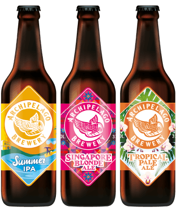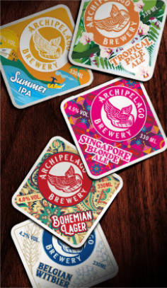 Functioning as the main canvas of the label is a stylised outline of Singapore (diamond shape). The Archipelago Brewery brand mark is a dynamic one, allowing for an overarching ‘standardised’ look and feel whilst providing room for variant customisation. The brand’s humorous personality is evidenced by the easter egg elements. The brand’s beer bottle plays a small, but pivotal role within each variant’s storytelling.